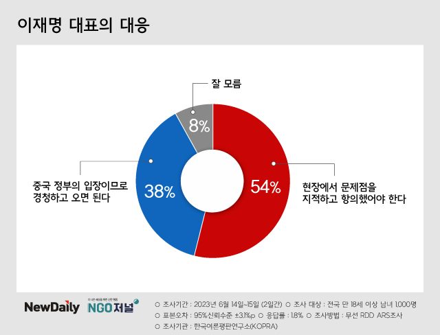 이재명 더불어민주당 대표가 논란이 된 싱하이밍 주한 중국대사의 '중국 패배에 베팅은 오판' 발언에 '항의했어야 한다'는 응답이 과반이라는 여론조사 결과가 16일 나왔다.뉴데일리와 NGO저널 의뢰로 여론조사업체 한국여론평판연구소(KOPRA)가 지난 14~15일 전국 만 18세 이상 남녀 1000명을 대상으로 '이재명 대표가 싱하이밍 대사의 발언에 대해 어떠한 항의도 하지 않았는데 이 대응에 대해 어떻게 생각하나'라고 물은 결과 '현장에서 문제점을 지적하고 항의했어야 한다'는 응답이 54%로 나타났다.반면, '중국정부의 입장이므로 경청하고 오면 된다'는 38%, '잘 모름'은 8%였다.싱 대사는 지난 8일 중국대사관저에서 이 대표와 만나 "미국이 승리하고 중국이 패배한다는 데 베팅하면 후회한다"며 협박성 발언을 해 내정간섭 논란을 일으켰다. 이 대표는 그러나 그 자리에서 아무런 대응을 하지 않아 민주당 내에서도 부적절했다는 비판이 나왔다.이와 관련, 윤석열 대통령의 외교안보정책을 긍정평가한 응답자의 92%, '중국이 비호감'이라는 응답자의 62%는 '항의했어야 한다'고 응답했다. 반면 윤 대통령의 외교안보정책을 부정평가하는 응답자의 63%, '중국에 호감을 갖고 있다'고 한 응답자의 64%가 '중국 입장이므로 경청하면 된다'고 응답했다.이념별로는 스스로 우파라고 밝힌 응답자의 75%가 '항의했어야 한다'에, 좌파라고 밝힌 응답자의 63%는 '중국 입장이므로 경청하면 된다'에 응답했다.지역별로 살펴보면 호남(42%)을 제외한 전 지역에서 '항의했어야 한다'는 응답 비율이 50% 이상을 기록했다. 서울 53%, 인천·경기 50%, 대전·세종·충청 64%, 대구·경북 60%, 부산·울산·경남 56%, 강원·제주 69%였다.연령별로는 '항의했어야 한다'에 응답한 비율이 18~29세 47%, 30대 54%, 40대 42%, 50대 50%, 60세 이상 68%로 집계됐다.성별로는 남성 58%, 여성 50%가 '항의했어야 한다'에 응답했다. 남성 35%, 여성 41%는 '중국 입장이므로 경청하면 된다'고 답했다.이번 여론조사는 휴대전화 RDD 100% 자동응답전화조사 방식으로 이뤄졌다. 응답률은 1.8%, 표본오차는 95% 신뢰수준에서 ±3.1%p다. 여론조사의 자세한 개요와 결과는 중앙선거여론조사심의위원회 홈페이지를 참고하면 된다.