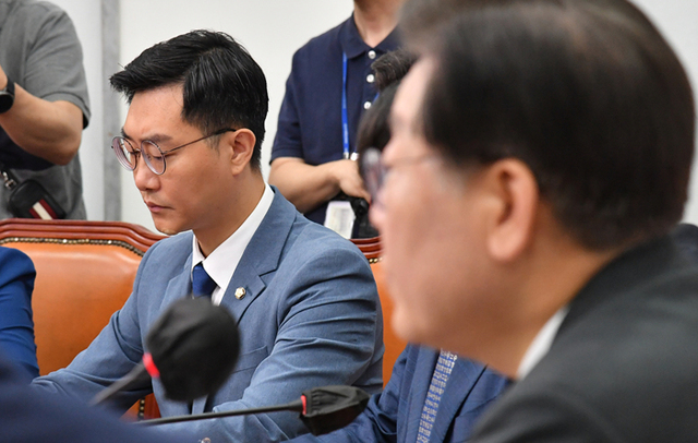 장경태 더불어민주당 의원이 14일 오전 국회에서 열린 최고위원회의에서 참석해 머리를 만지고 있다.
