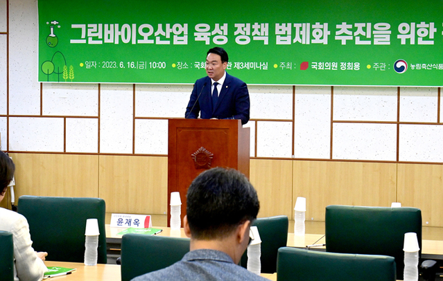 정희용 국민의힘 의원이 16일 오전 국회 의원회관에서 열린 그린바이오산업 육성 정책 법제화 추진을 위한 정책토론회에서 인사말을 하고있다.