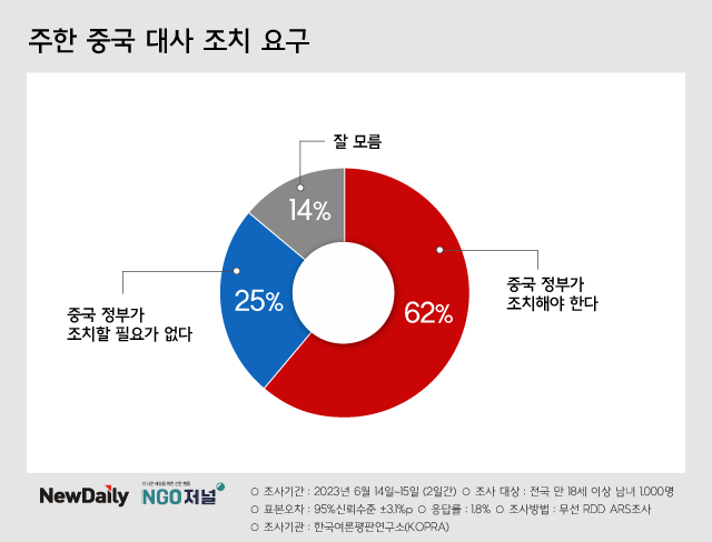 전연령, 전지역, 남녀 모두 "한국 무시, 협박성 발언"… 싱하이밍에 분노국민 62%가 "중국이 조치해야 한다"… "조치할 필요 없다"는 25%에 불과해