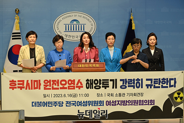 이재정 더불어민주당 의원이 16일 오후 국회 소통관에서 '후쿠시마 원전 오염수 해양투기'를 규탄하는 성명을 하고 있다.