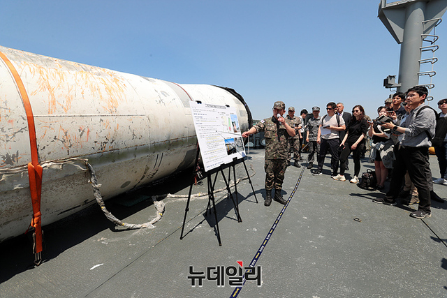 우리군 관계자가 16일 오후 경기 평택시 해군 제2함대 사령부에서 인양된 북한 우주발사체 '천리마 1형'의 잔해 관련 브리핑을 진행하고 있다. (사진=공동취재단)
