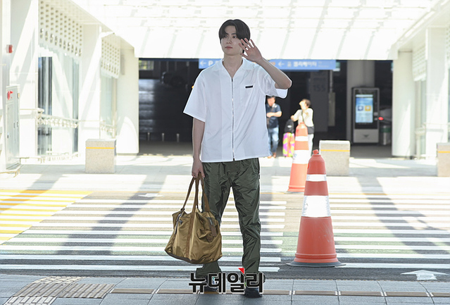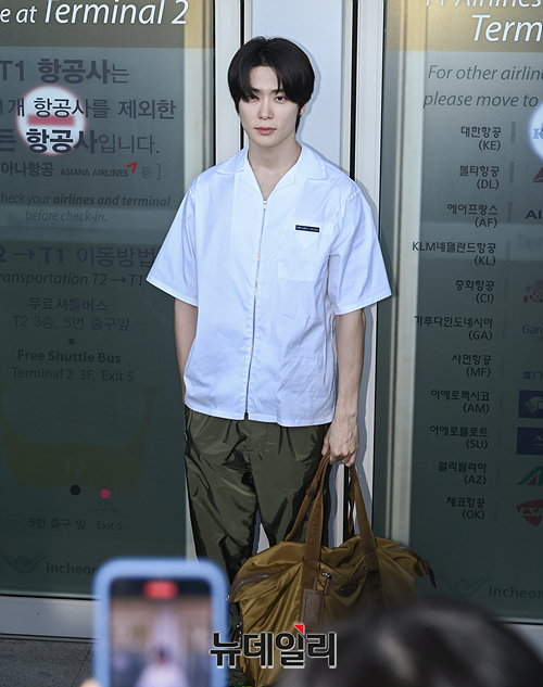 NCT 재현이 '프라다 UOMO SS24 쇼' 참석을 위해 17일 오전 인천국제공항에서 출국하며 포즈를 취하고 있다. (인천=서성진 기자)