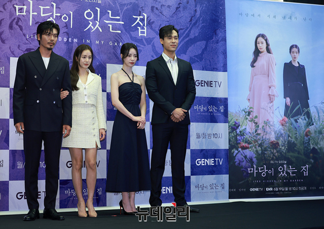 배우 김성오(왼쪽부터), 김태희, 임지연, 최재림이 19일 오후 서울 마포구 스텐포드 호텔에서 열린 지니TV 오리지널 '마당이 있는 집(연출 정지현, 극본 지아니)' 제작보고회에서 포토타임을 갖고 있다.동명의 베스트셀러 소설을 원작으로한 드라마 '마당이 있는 집'은 뒷마당에서 나는 수상한 냄새로 인해 완전히 다른 삶을 살던 두 여자가 만나 벌어지는 서스펜스 스릴러다.배우 김태희, 임지연, 김성오, 최재림 등이 출연한다. 8부작으로 지니TV와 ENA에서 19일 밤 10시 첫 공개.