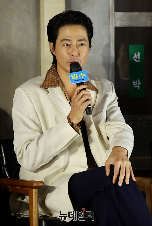 배우 조인성이 20일 오전 서울 광진구 롯데시네마 건대입구점에서 열린 영화 '밀수(감독 류승완)' 제작보고회에서 인사말을 하고 있다.