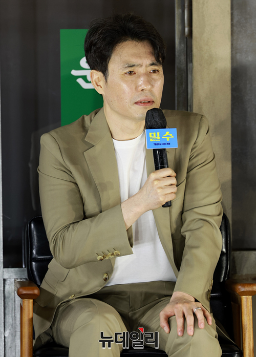 류승완 영화감독이 20일 오전 서울 광진구 롯데시네마 건대입구점에서 열린 영화 '밀수(감독 류승완)' 제작보고회에서 인사말을 하고 있다.
