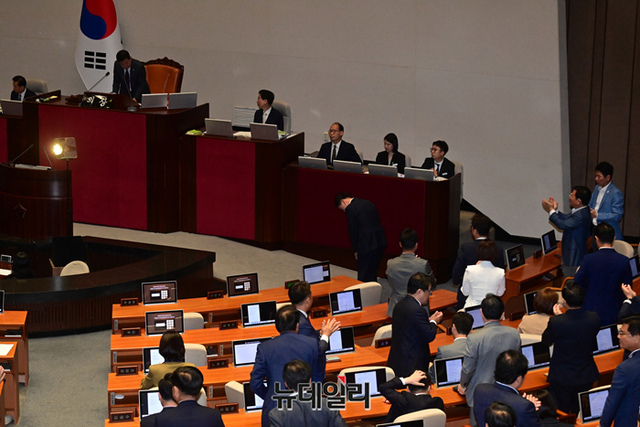 김기현 국민의힘 대표가 20일 오전 국회에서 열린 본회의에서 교섭단체 대표연설을 마치고 동료 의원들과 인사를 나누고 있다.