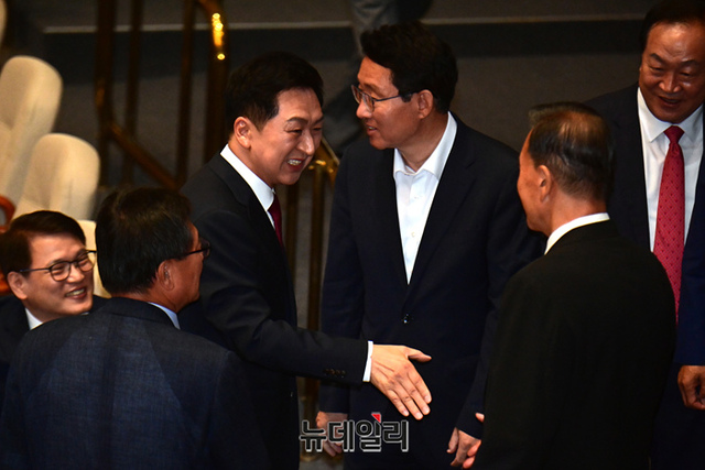 [포토] 의원들과 인사 나누는 김기현 국민의힘 대표