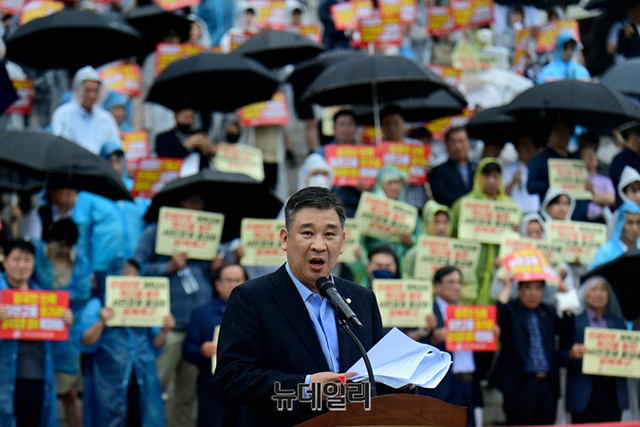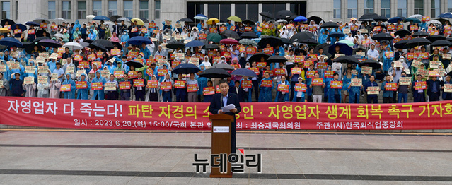 최승재 국민의힘 의원이 20일 국회 본청 앞에서 열린 자영업자·소상공인 생계 회복 촉구 기자회견에서 발언하고 있다.