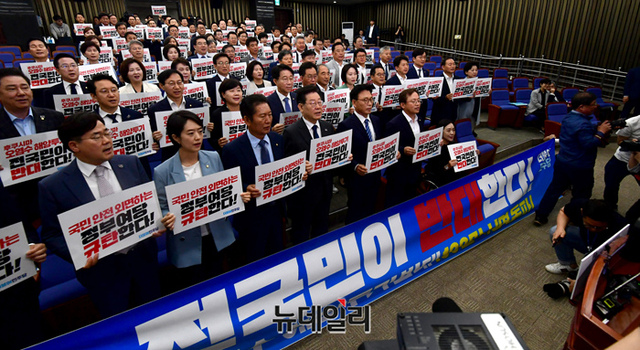 이재명 더불어민주당 대표 및 소속 의원들이 21일 오전 국회에서 열린 정책의원총회에서 일본 후쿠시마 오염수 방류와 윤석열 정부를 규탄하고 있다.