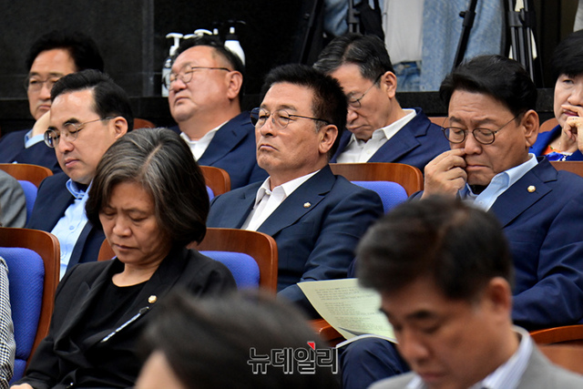 일본 후쿠시마 오염수 해양 투기 반대 단식 투쟁을 하고 있는 윤재갑 더불어민주당 의원이 21일 오전 국회에서 열린 의원총회에서 참석해 앉아 있다.