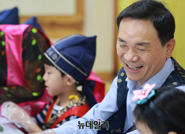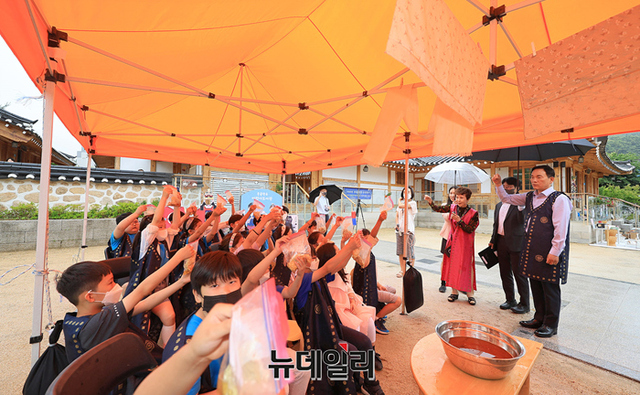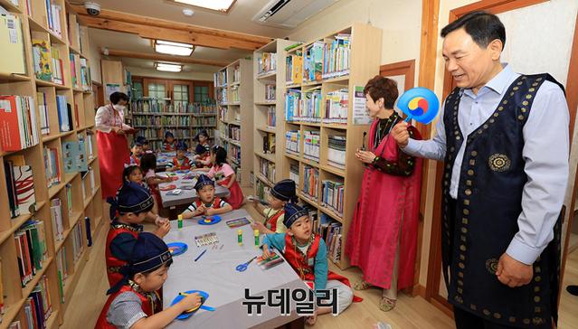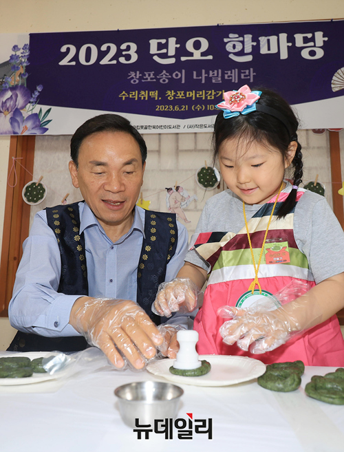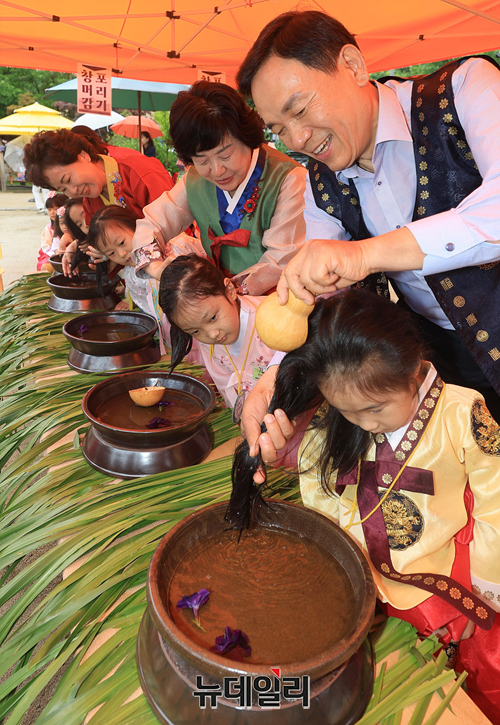 조성명 강남구청장이 21일 오전 서울 강남구 못골한옥어린이도서관에서 단오맞이 행사에서 어린이들과 창포 머리감기 체험을 하고 있다.