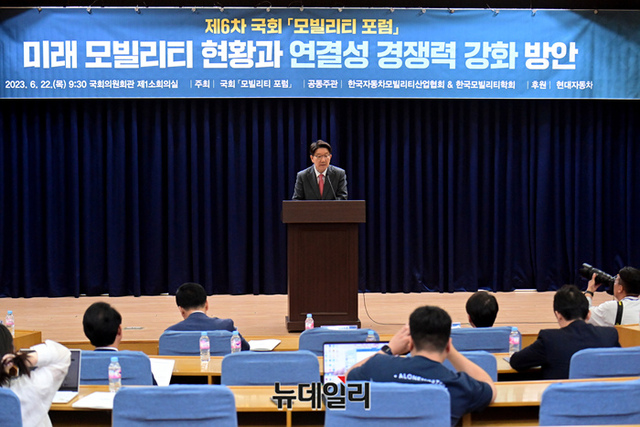 권성동 국민의힘 의원이 22일 오전 국회 의원회관에서 열린 제6차 국회모빌리티 포럼에서 인사말을 하고 있다.