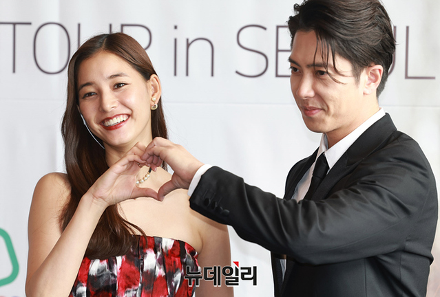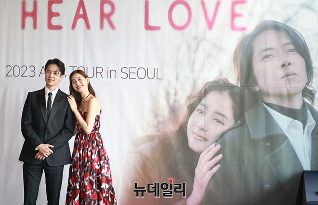 일본배우 야마시타 토모히사, 아라키 유코가 22일 오전 서울 강남구 인터컨티넨탈 서울코엑스에서 열린 영화 'SEE HEAR LOVE(보지 못하고 듣지 못하고 사랑해, 감독 이재한)' 아시아투어 기자간담회에서 포토타임을 갖고 있다.'SEE HEAR LOVE'는 카카오웹툰에 연재된 '보지 못하고듣지 못하고 사랑해'를 원작으로 시각장애를 얻게 된 남성 웹툰 작가 신지가 선천적 청각장애를 지닌 여성 히비키를 만나 진정한 사랑과 희망을 느끼는 이야기다.한국 방문을 시작으로 아시아 투어에 나선 두 배우는 홍콩, 대만, 태국 등 4개 지역을 방문할 예정이다.