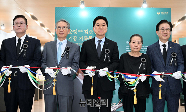 김기현 국민의힘 대표와 이명우 국회도서관장, 정우택 국회부의장, 김 전 총리의 장녀 김예리 씨 등이 23일 국회 도서관에서 열린 운정(雲庭) 김종필 기증 기록물 전시 개막식에서 테이프 커팅을 하 있다.