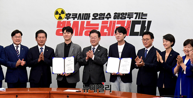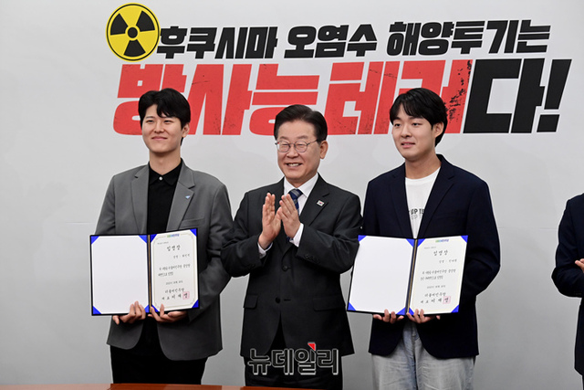 이재명 더불어민주당 대표가 26일 오전 국회에서 열린 청년대변인 임명장 수여식에서 최민석 · 선사윗 청년대변인에게 임명장을 수여 후 기념촬영을 하고 있다.