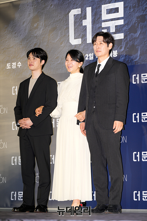 김용화 감독(왼쪽부터), 배우 도경수, 김희애, 설경구가 27일 오전 서울 용산구 CGV 용산아이파크몰에서 열린 영화 '더 문(The Moon)' 제작보고회에서 포토타임을 갖고 있다.
