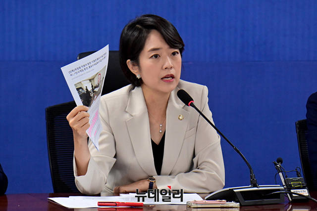 고민정 더불어민주당 의원이 27일 오전 국회 의원회관에서 열린 더불어민주당 과방위원 방송현안 간담회에서 발언하고 있다.