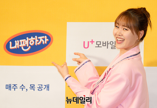코미디언 엄지윤이 27일 오후 서울 서초구 더 리버사이드 호텔에서 열린 U+모바일tv새 예능 '내편하자(연출 양자영)' 기자간담회에서 포토타임을 갖고 있다.