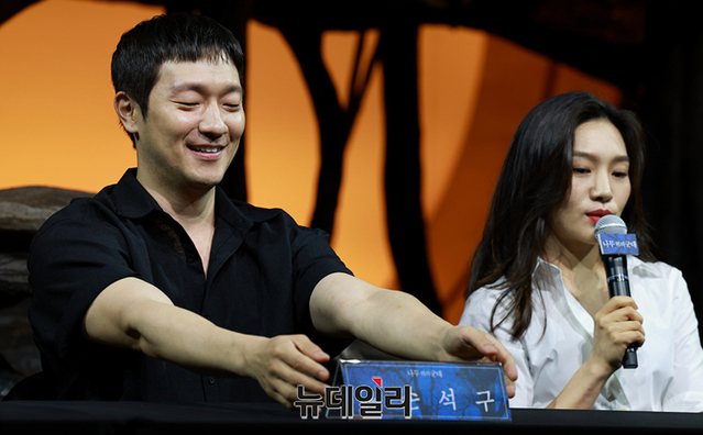 배우 손석구, 최희서가 27일 오후 서울 강서구 LG아트센터 서울에서 열린 연극 '나무 위의 군대(연출 민새롬)' 기자간담회에서 인사말을 하고 있다.'나무 위의 군대'는 LG아트센터와 엠피앤컴퍼니의 공동제작으로 1945년 4월 태평양 전쟁의 막바지 오키나와에서 일본의 패전도모른채 약 2년 동안 가쥬마루 나무 위에 숨어서 살아남은 두 병사의 실화를 바탕으로 한 연극이다.6월 20일부터 8월 12일까지 LG아트센터서울 U+스테이지에서 공연된다.