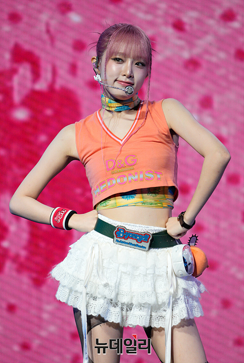 솔로가수 YENA(최예나)가 27일 오후 서울 용산구 블루스퀘어에서 열린 두 번째 싱글앨범 'HATE XX' 발매기념 쇼케이스에서 타이틀곡 '헤이트 로드리고(Hate Rodrigo)' 무대를 선보이고 있다.