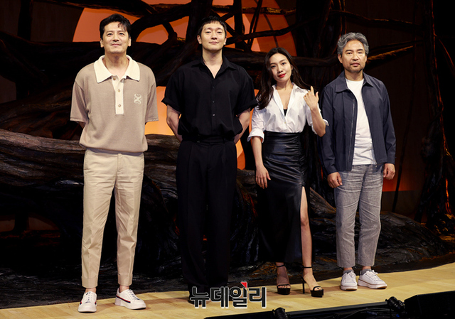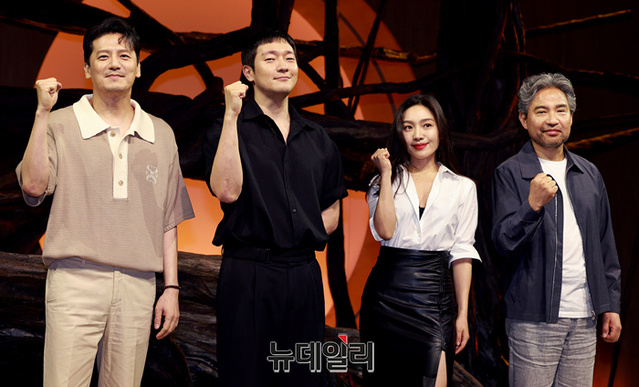배우 이도엽(왼쪽부터), 손석구, 최희서, 김용준이 27일 오후 서울 강서구 LG아트센터 서울에서 열린 연극 '나무 위의 군대(연출 민새롬)' 기자간담회에서 포토타임을 갖고 있다.'나무 위의 군대'는 LG아트센터와 엠피앤컴퍼니의 공동제작으로 1945년 4월 태평양 전쟁의 막바지 오키나와에서 일본의 패전도모른채 약 2년 동안 가쥬마루 나무 위에 숨어서 살아남은 두 병사의 실화를 바탕으로 한 연극이다.6월 20일부터 8월 12일까지 LG아트센터서울 U+스테이지에서 공연된다.
