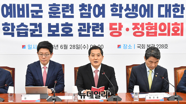 박대출 국민의힘 정책위의장이 28일 오전 국회에서 열린 예비군 훈련 참여 학생에 대한 학습권 보호 관련 당·정협의회에서 모두발언을 하고 있다.