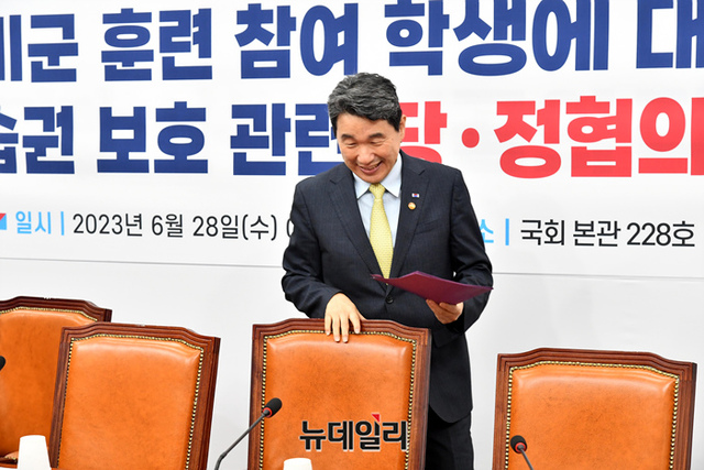 이주호 사회부총리 겸 교육부 장관이 28일 오전 국회에서 열린 예비군 훈련 참여 학생에 대한 학습권 보호 관련 당·정협의회에서 참석하고 있다.