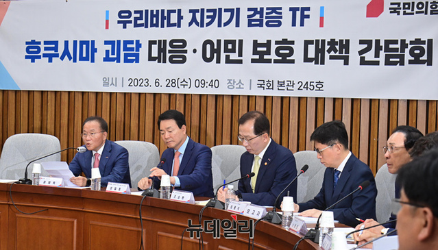 윤재옥 국민의힘 원내대표가 28일 오전 국회에서 열린 '우리바다 지키기 검증 TF 후쿠시마 괴담 대응·어민 보호 대책 간담회'에서 인사말을 하고 있다.이날 윤 원내대표는 "민주당이 후쿠시마 오염수를 앞세워 국민께 공포를 조장하고 정치적으로 이용하는 선동정치가 극에 달하고 있다"며 "후쿠시마 수산물에 대한 정확한 팩트는 대한민국 정부는 국민 안전에 대해 인정할 때까지 절대 후쿠시마산 수입 금지를 해제하지 않는다는 거다. 민당은 수산물 수입 허용처럼 수입 반대를 외치고 과학적 근거 없이 공포를 조장해 천일염 사재기를 조장한다"며 더불어민주당을 비판했다.