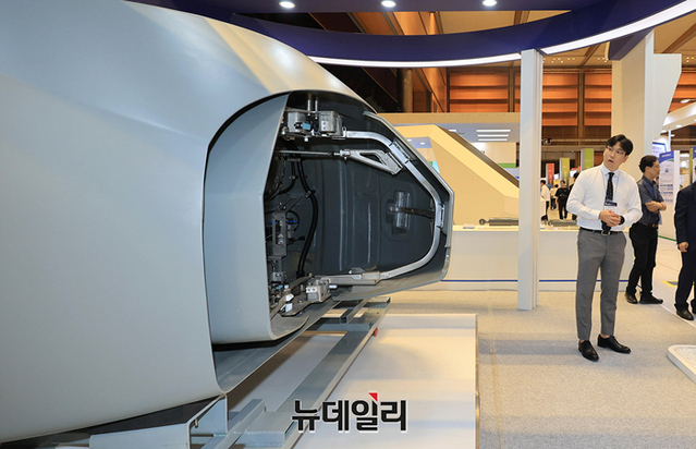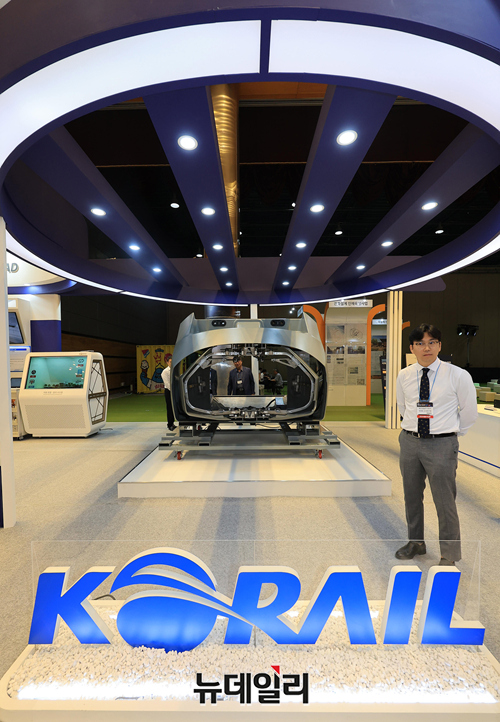 '2023 국토교통 기술대전'을 찾은 학생들이 28일 오전 서울 강남구 코엑스 D홀에 마련된 국가철도공단 부스를 관람하고 있다.