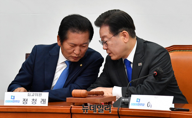 이재명 더불어민주당 대표가 30일 오전 국회에서 열린 최고위원회의에 참석해 정청래 최고위원과 대화를 나누고 있다.