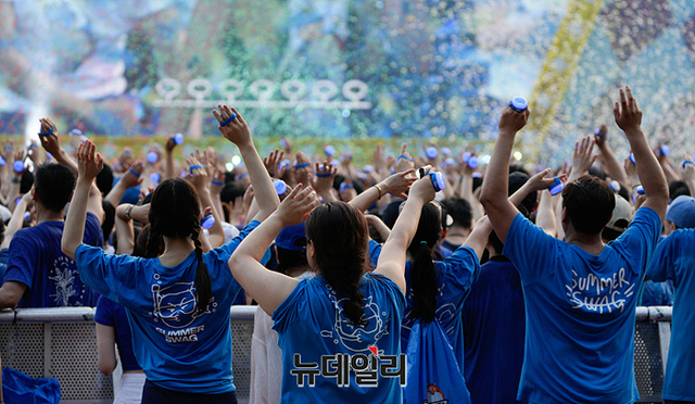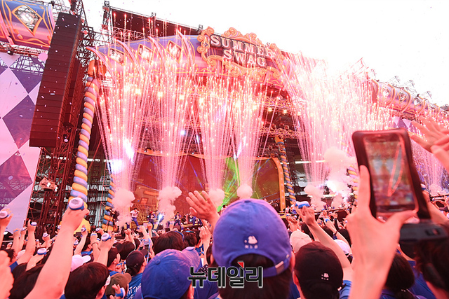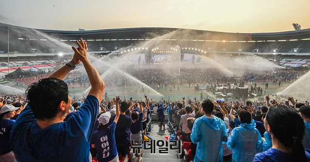'싸이 흠뻑쇼'를 찾은 관람객들이 30일 오후 서울 송파구 올림픽주경기장에서 열린 쇼를 즐기고 있다. '싸이 흠뻑쇼 SUMMER SWAG 2023'은 7월 2일까지 서울 잠실주경기장에서 열린다.