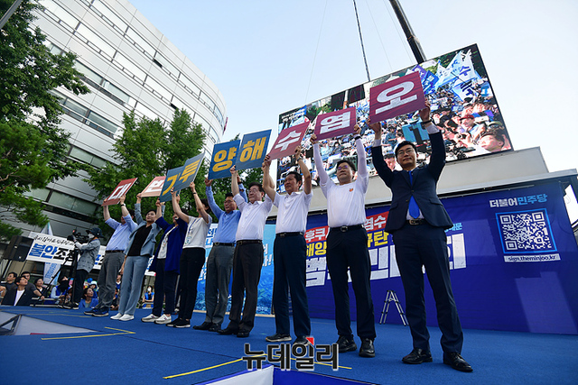 더불어민주당 지도부가 1일 오후 서울 숭례문 광장 인근에서 열린 '후쿠시마 오염수 해양투기 규탄 범국민대회'에서 피켓을 들고 퍼포먼스를 하고 있다.