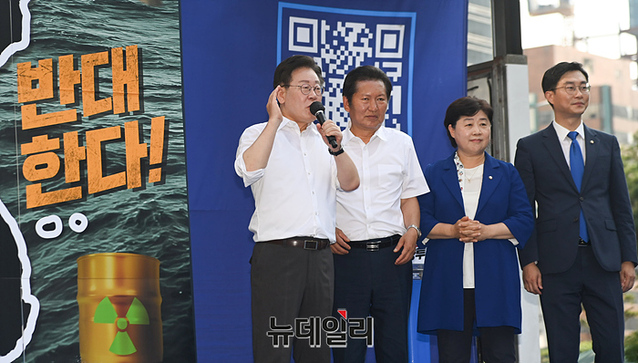 이재명 더불어민주당 대표가 1일 오후 서울 숭례문 광장 인근에서 열린 '후쿠시마 오염수 해양투기 규탄 범국민대회'에서 발언 하고 있다.