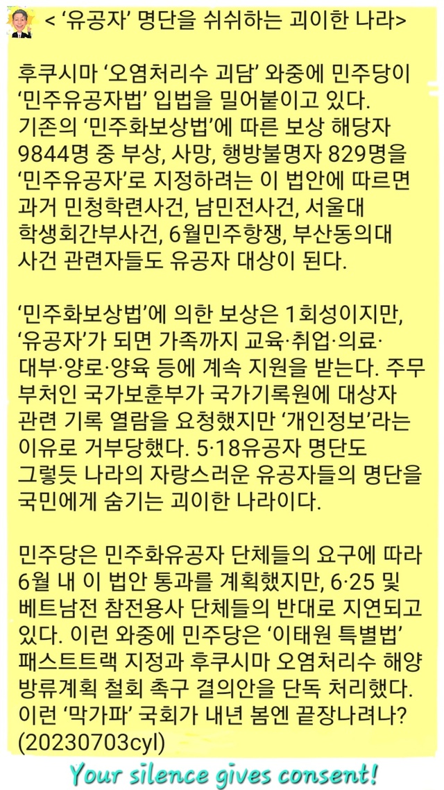 후쿠시마 ‘오염처리수 괴담’ 와중에, 민주당이 ‘민주유공자법’ 입법을 밀어붙이고 있다.