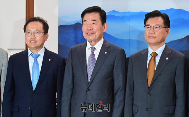 김진표 국회의장이 3일 국회 의장실에서 열린 '여야 2+2 선거제 개편 협의체 발족식'에서 국민의힘·더불어민주당 원내수석부대표· 정치개혁특별위원회 간사와 기념촬영을 하고 있다.
