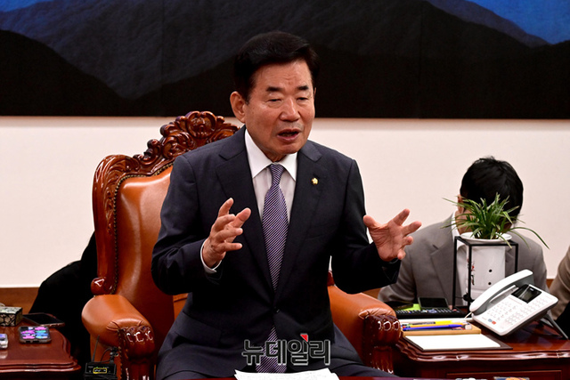 김진표 국회의장이 3일 국회 의장실에서 열린 '여야 2+2 선거제 개편 협의체 발족식'에서 모두발언을 하고 있다.