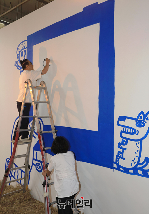 김태중 작가가 3일 오전 서울 성동구 에스팩토리에서 열린 예스24 창립 24주년 기념 '생각 지상 주의자들의 요람' 전시에서 라이브 드로잉을 선보이고 있다.