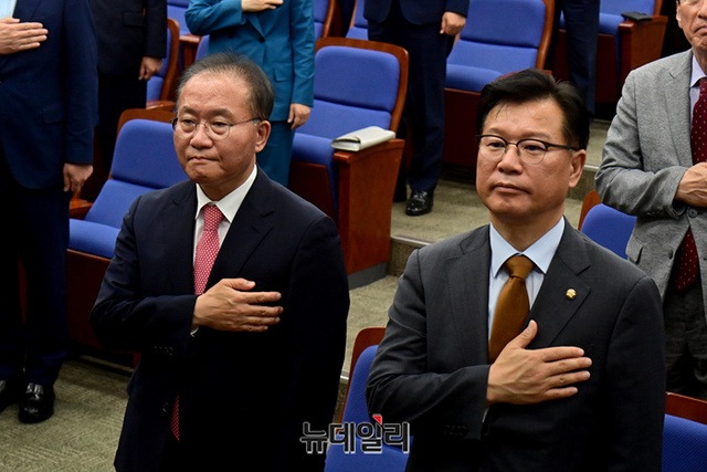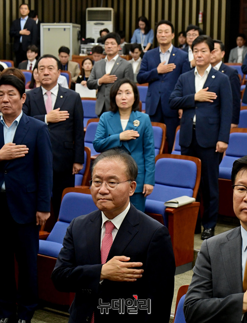 윤재옥 국민의힘 원내대표와 소속 의원들이 3일 오후 국회에서 열린 의원총회에 참석해 국민의례를 하고 있다.