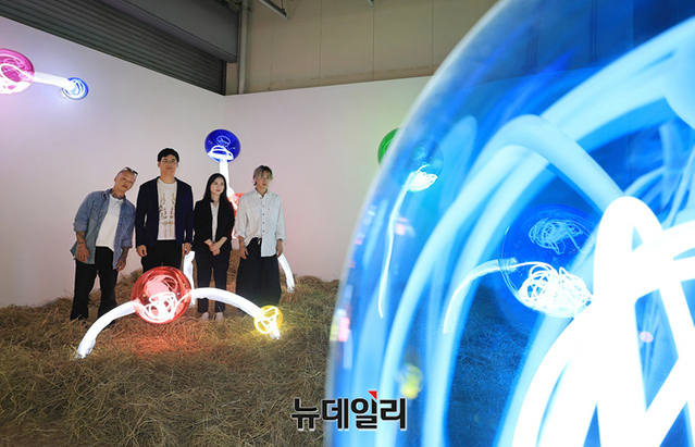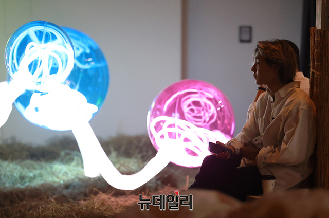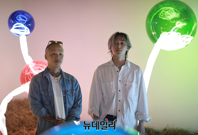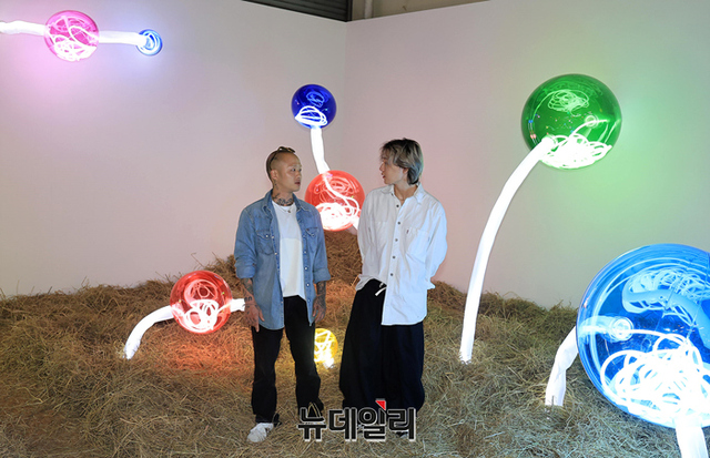 소효소(던&소키)가 3일 오전 서울 성동구 에스팩토리에서 열린 예스24 창립 24주년 기념 '생각 지상 주의자들의 요람' 전시에서 작품 앞에서 포즈를 취하고 있다.