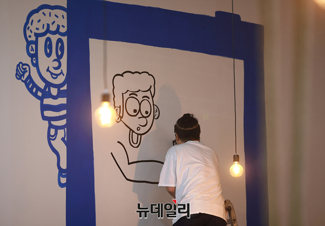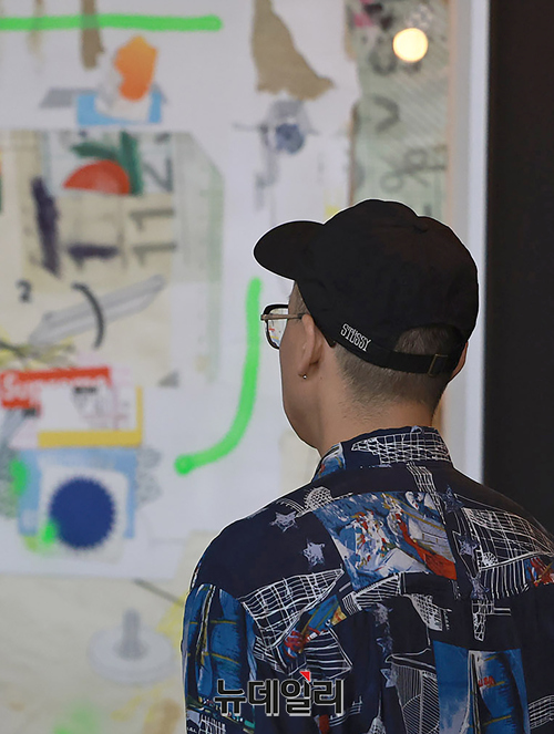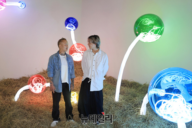 김태중(왼쪽부터) 작가, 김선익 작가, 빠키 작가, 최세라 예스24 대표, 김석환 한세예스24홀딩스 부회장, 던&소키가 3일 오전 서울 성동구 에스팩토리에서 열린 예스24 창립 24주년 기념 '생각 지상 주의자들의 요람' 전시에서 기념촬영을 하고 있다.