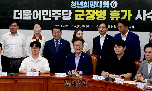 이재명 더불어민주당 대표가 4일 국회에서 열린 청년희망대화 '군장병 휴가불평등 문제개선 관련 간담회'기념촬영을 하고 있다.