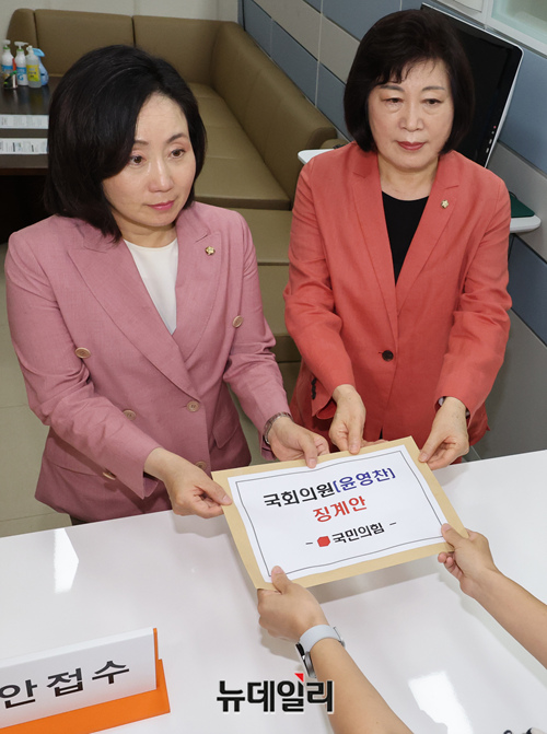 정경희 국민의힘 원내부대표와 전주혜 원내대변인이 4일 오후 국회 의안과에 윤영찬 더불어민주당 의원 징계안을 제출하고 있다.