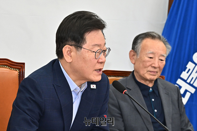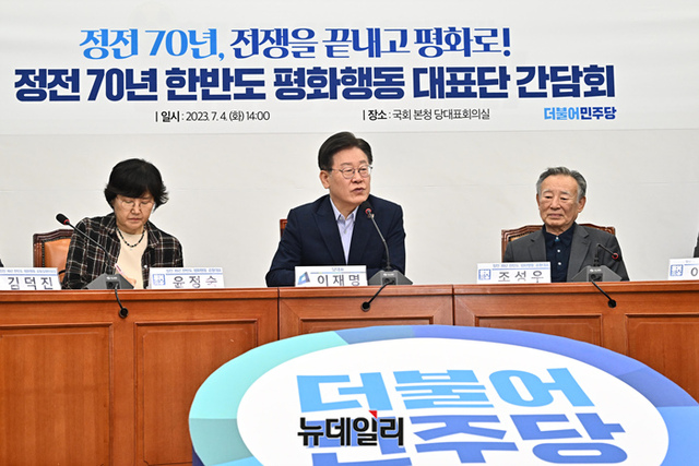 이재명 더불어민주당 대표가 4일 국회에서 열린 '정전 70년 한반도 평화행동 대표단 간담회'에서 모두발언을 하고 있다.