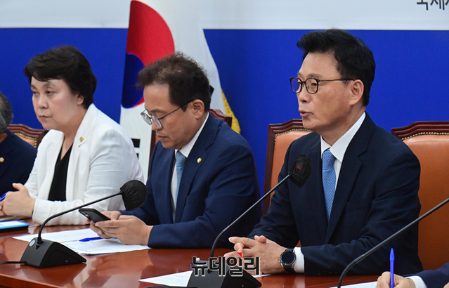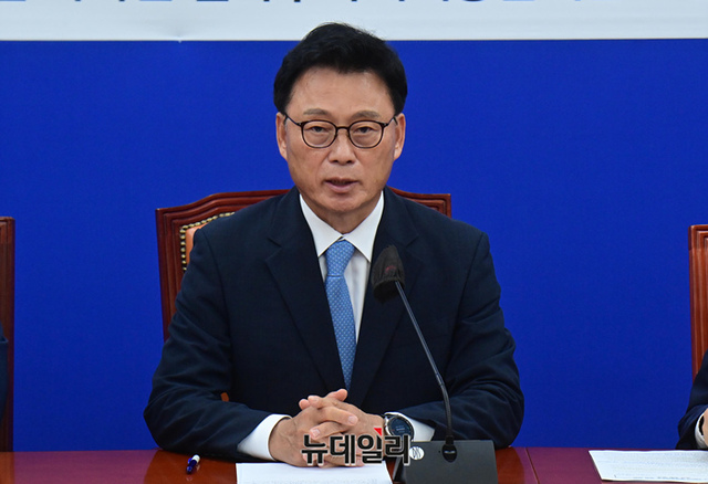 박광온 더불어민주당 원내대표가 6일 오전 국회에서 열린 정책조정회의에 참석해 발언을 하고 있다.
