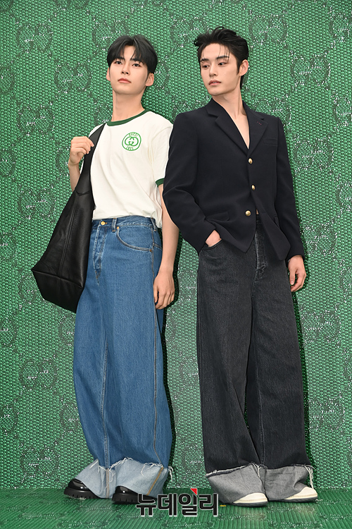 제로베이스원 한빈과 지웅이 6일 오전 서울 용산구 구찌가옥에서 진행된 '구찌 2023 가을/겨울 남성 컬렉션 및 발리제리아 트래블 라인 신제품 출시' 기념 포토콜에서 포즈를 취하고 있다.