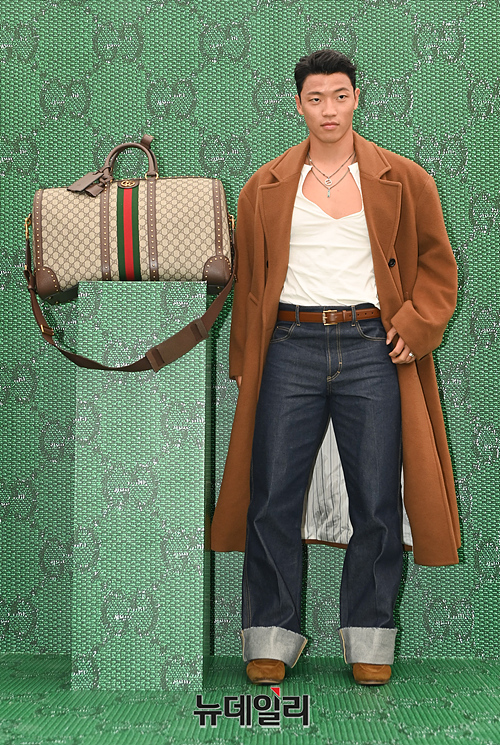 축구선수 황희찬이 6일 오전 서울 용산구 구찌가옥에서 진행된 '구찌 2023 가을/겨울 남성 컬렉션 및 발리제리아 트래블 라인 신제품 출시' 기념 포토콜에서 포즈를 취하고 있다.