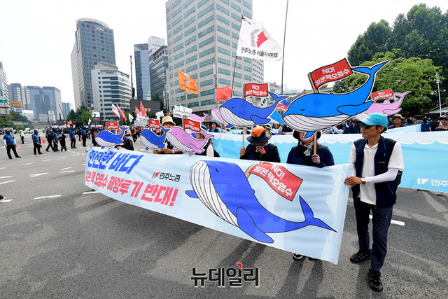 민노총이 6일 오후 서울 중구 숭례문 일대에서 열린 전국노동자대회에서 일본 오염수 반대 피켓을 들고 있다.