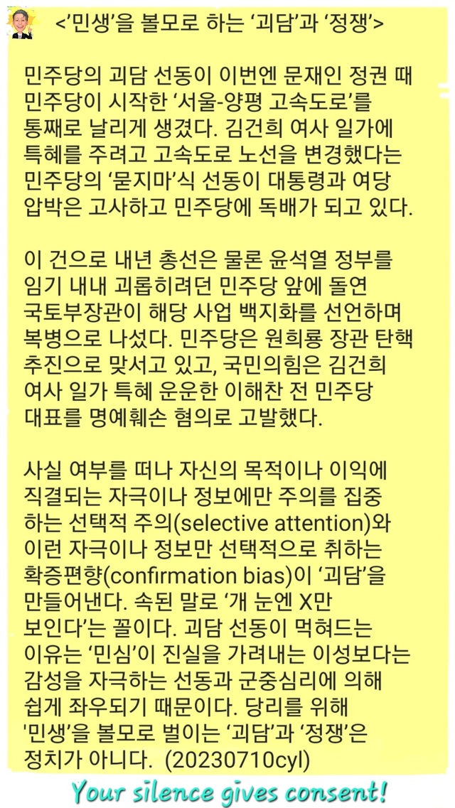 <’민생’을 볼모로 하는 ‘괴담’과 ‘정쟁’>민주당의 괴담 선동이 이번엔 문재인 정권 때 민주당이 시작한 ‘서울-양평 고속도로’를 통째로 날리게 생겼다.