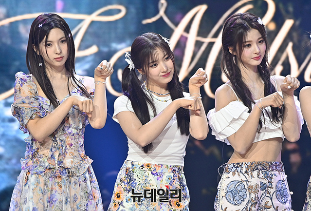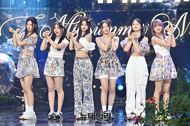 걸그룹 엔믹스(NMIXX) 베이, 지우, 설윤, 규진, 해원, 릴리가 11일 오후 서울 용산구 블루스퀘어에서 열린 싱글 3집 'A Midsummer NMIXX's Dream' 발매기념 쇼케이스에서 포토타임을 갖고 있다.